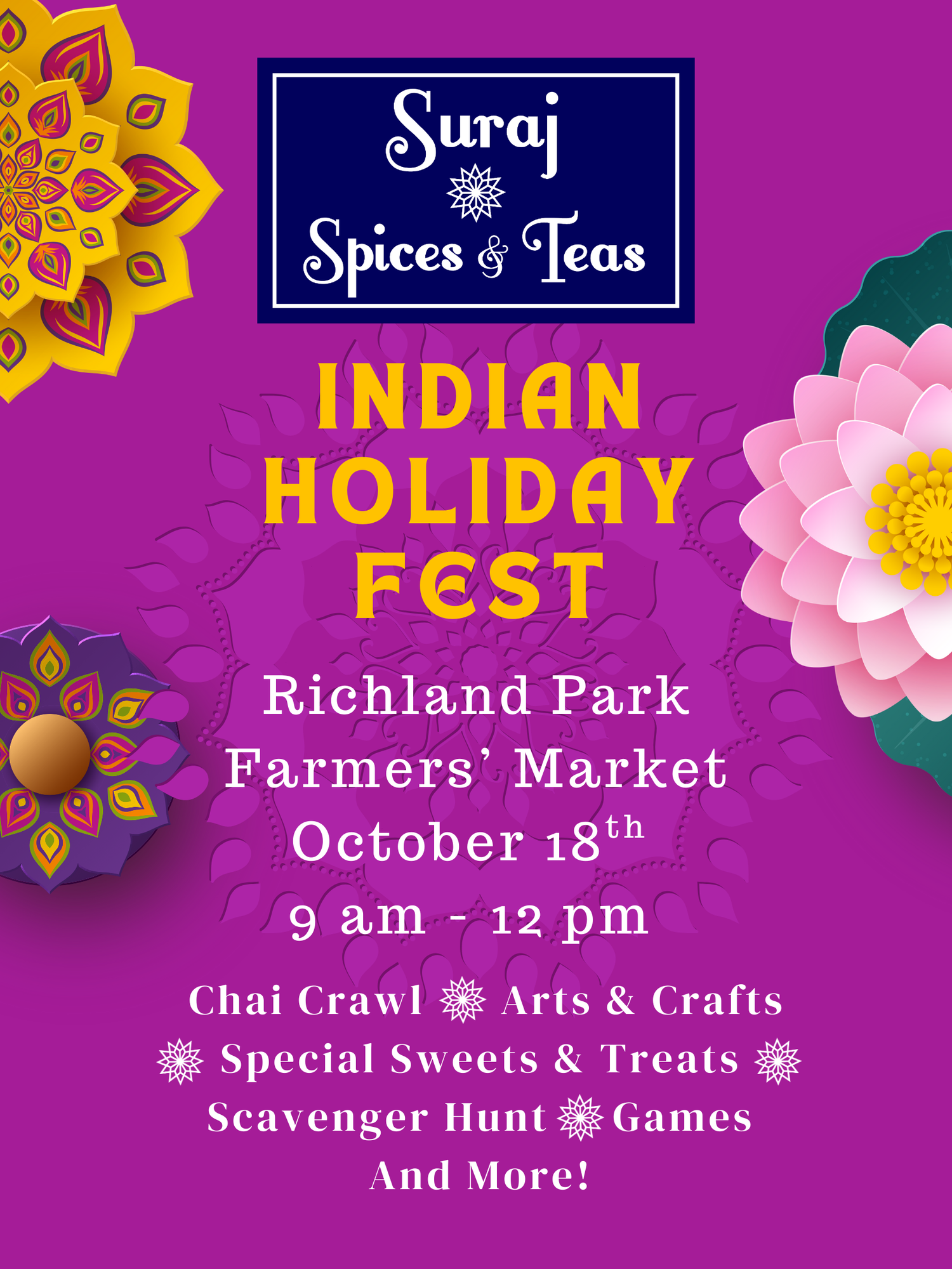 Join us in October 18th as we host the 3rd Indian Holiday Fest at Richland Park Farmers' Market. There will be chai, snacks, arts and crafts, scavenger hunts, and more, including a new Eating Contest.