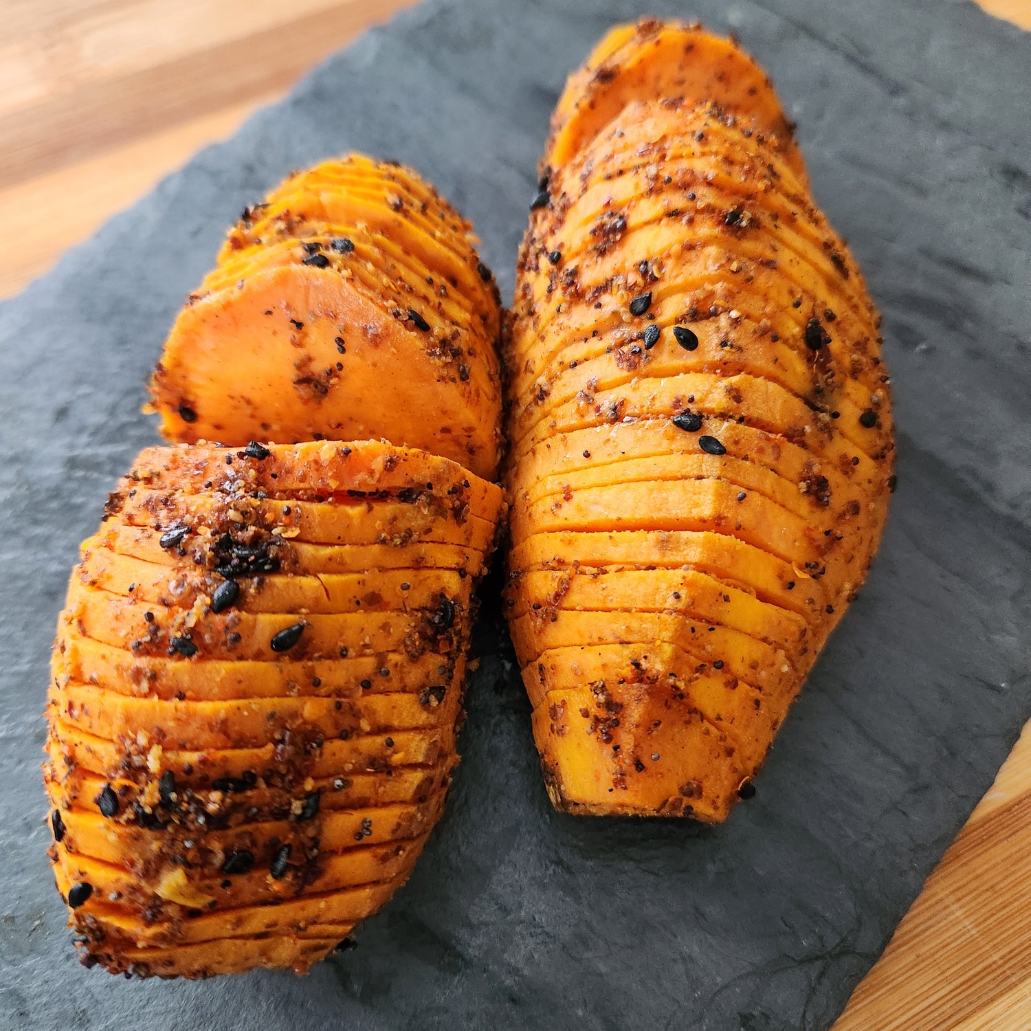 Brush Shichimi Togarashi onto Hasselback sweet potatoes before roasting for a spicy, citrus, crunchy crust. For every 2 sweet potatoes, we stirred 1 tsp of the Togarashi into 1 Tablespoon each melted butter and oil.