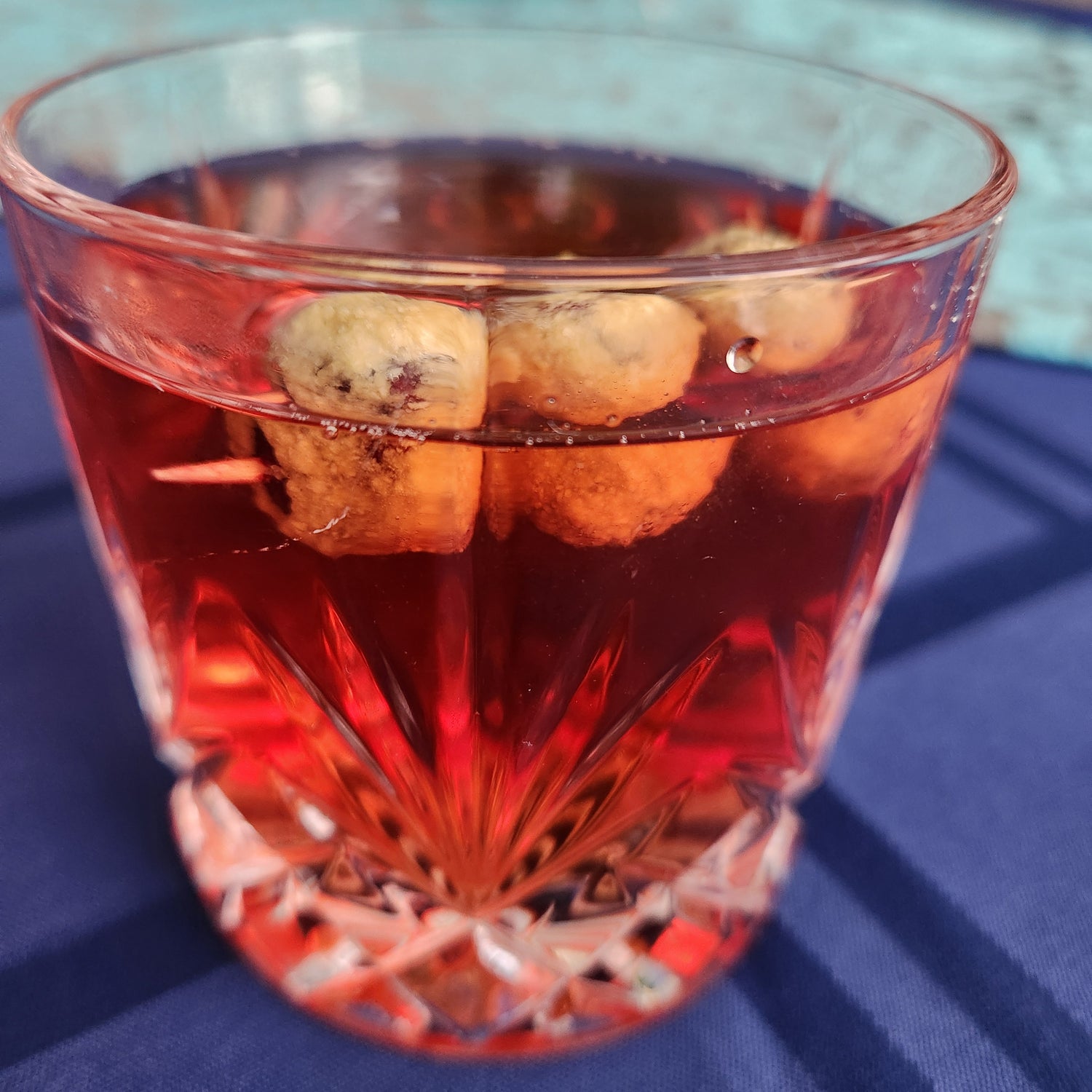 Soak fresh cranberries in maple syrup, then roll into sugar before air drying on a rack or plate. This time, we've used maple sugar but you can use our Vanilla or Cinnamon Orange Sugar. Use to garnish drinks, like this cold brewed Spiced Rosehip. Top off with rum or seltzer.