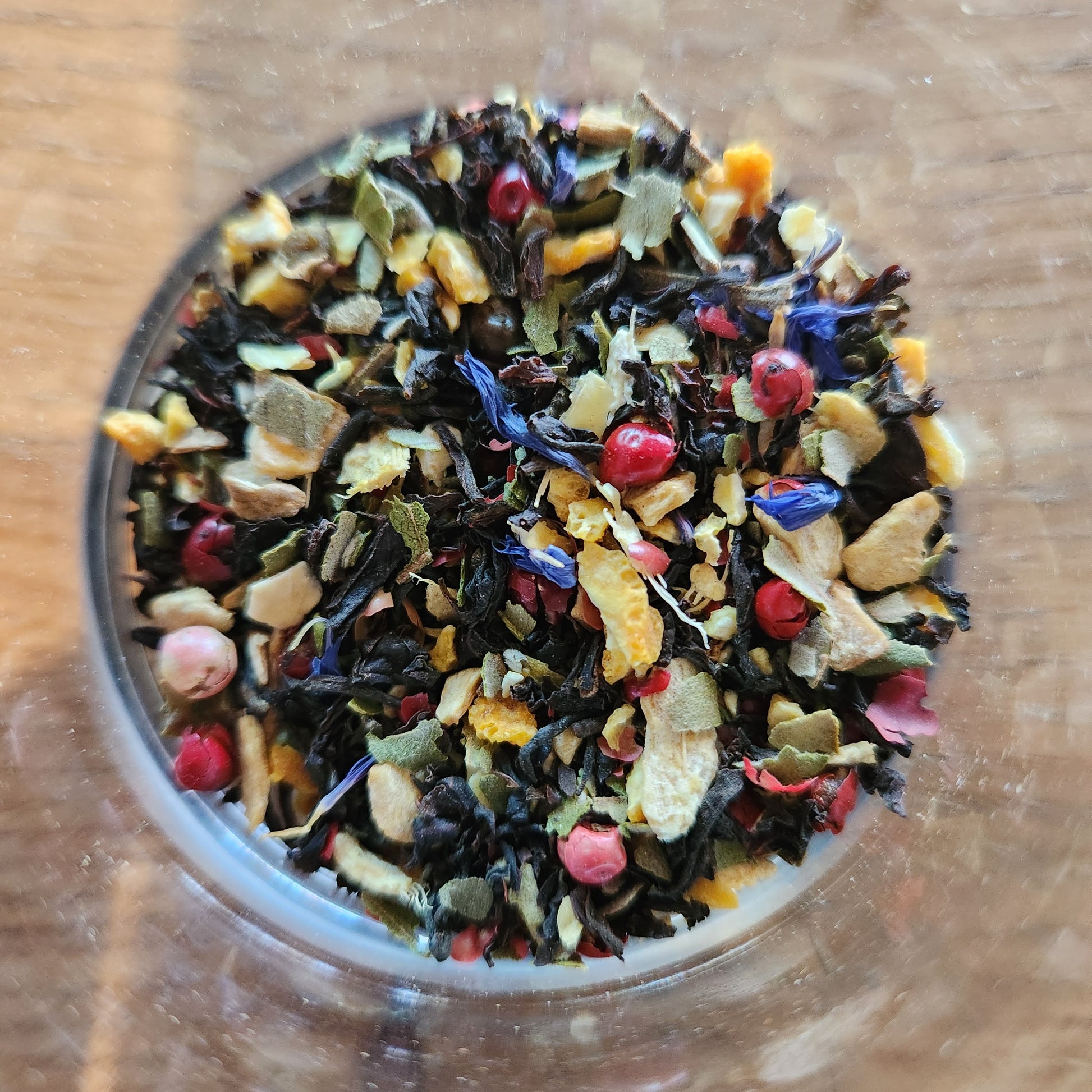 Black Tea, Ginger*, Orange*, Pink Pepper, Lemon Myrtle,* Cornflower Petals, Natural Flavors