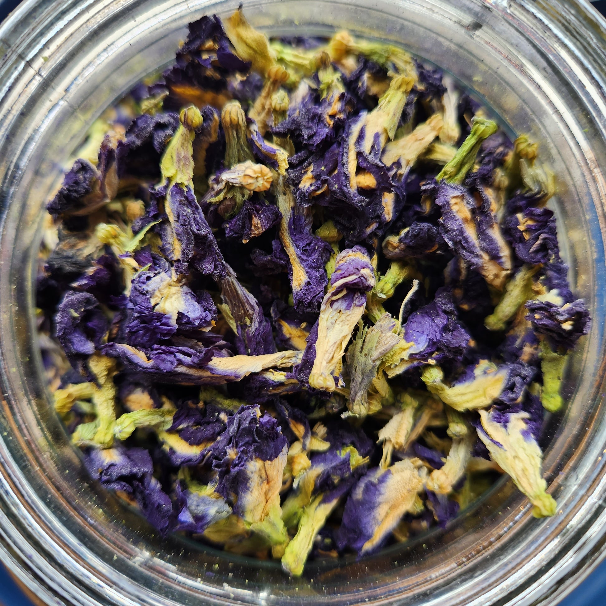 Butterfly pea flowers are a member of the Fabaceae family and their orchid shaped buds can be steeped as a tea or used as natural food coloring. The flowers brew a beautiful blue color that changes to a royal purple when added with acidic foods like lemon or other citrus juices. The very mild woody flavor compliments other flavors well - try combining with sour fruit, mint, and other flowers like rose buds and lavender.