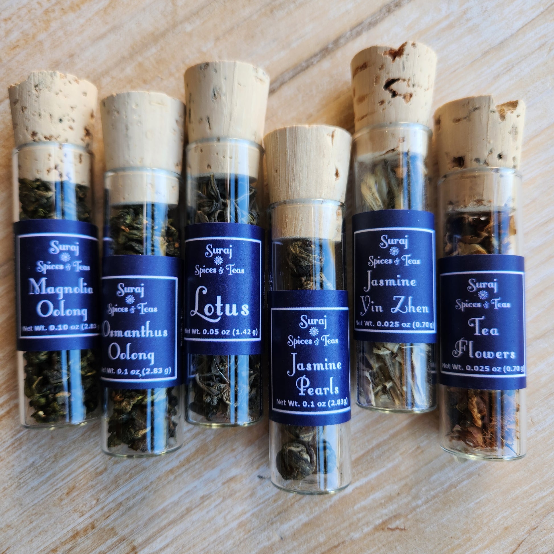 This set of floral scented flowers is a bouquet of different teas, flowers, and flavors. Note the differences while you sip through white Jasmine Yin Zhen, green Jasmine Pearls and Lotus, and the Osmanthus and Magnolia oolongs. Finish it out with a cup brewed from the actual flowers of the tea plant.