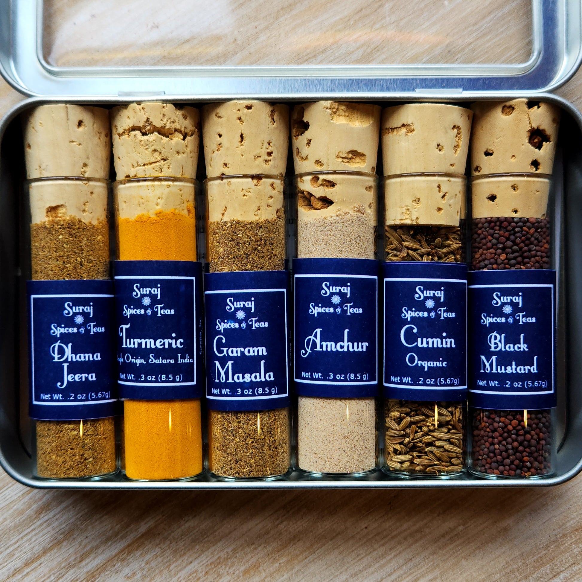 Expand your pantry and your cooking with this Indian spice set - a selection of spices used often in Gujarati and Indian cuisines. This set features Amchur, Cumin, Mustard Seed, Dhana Jeera, Garam Masala, and Turmeric. Each spice comes in a cork topped glass bottle and the set is stored in a window tin. Inside each set is a description of each of the spices and suggestions on how to use them.