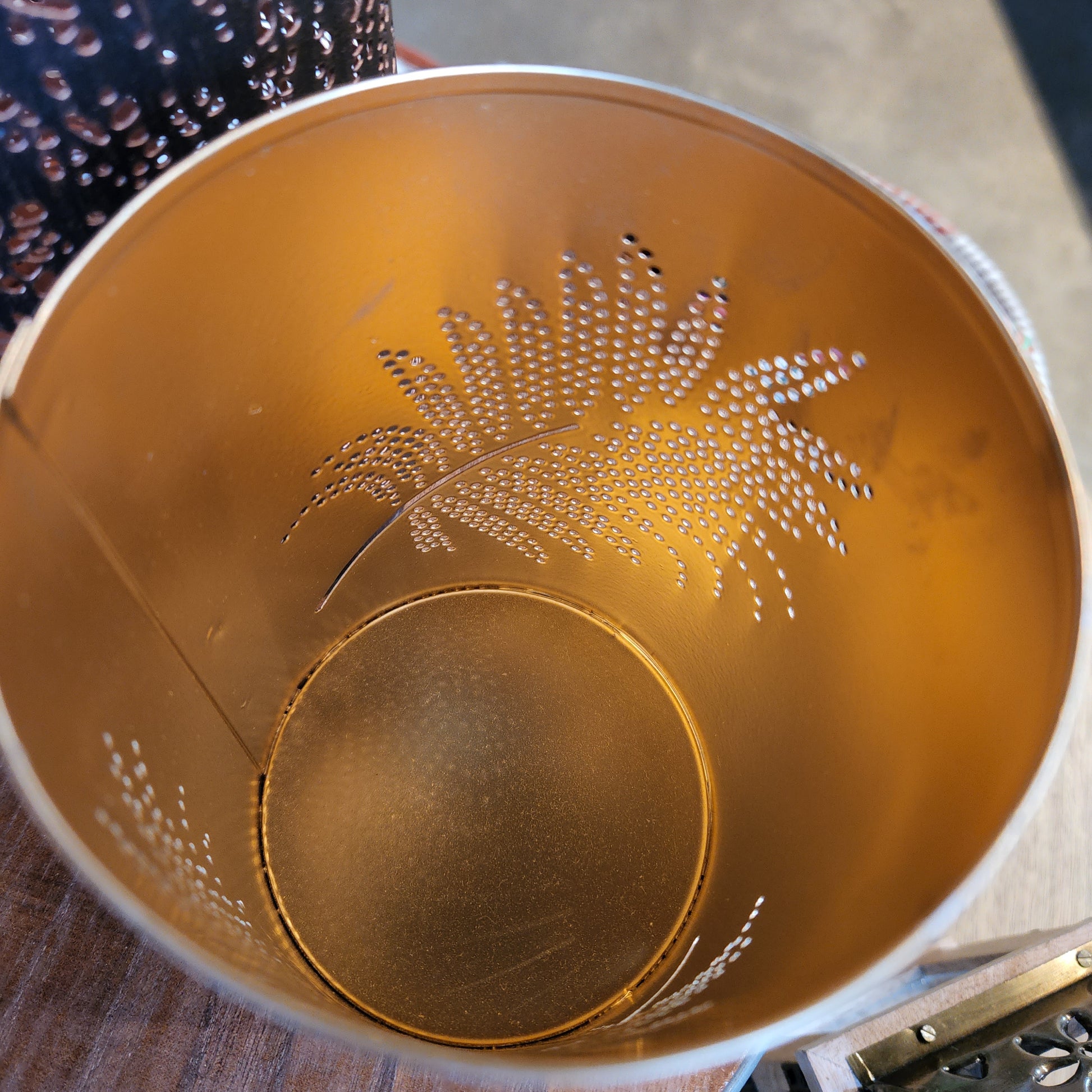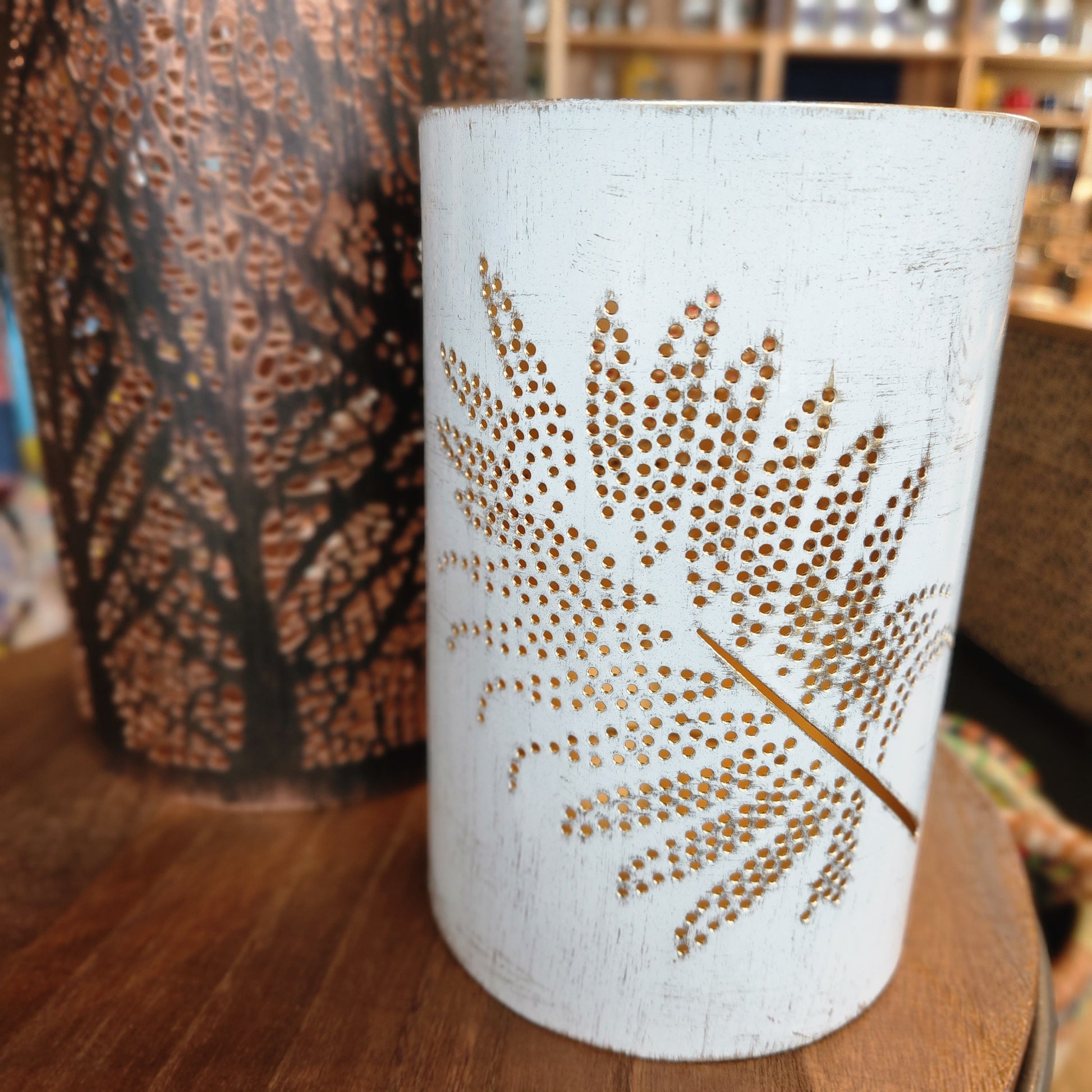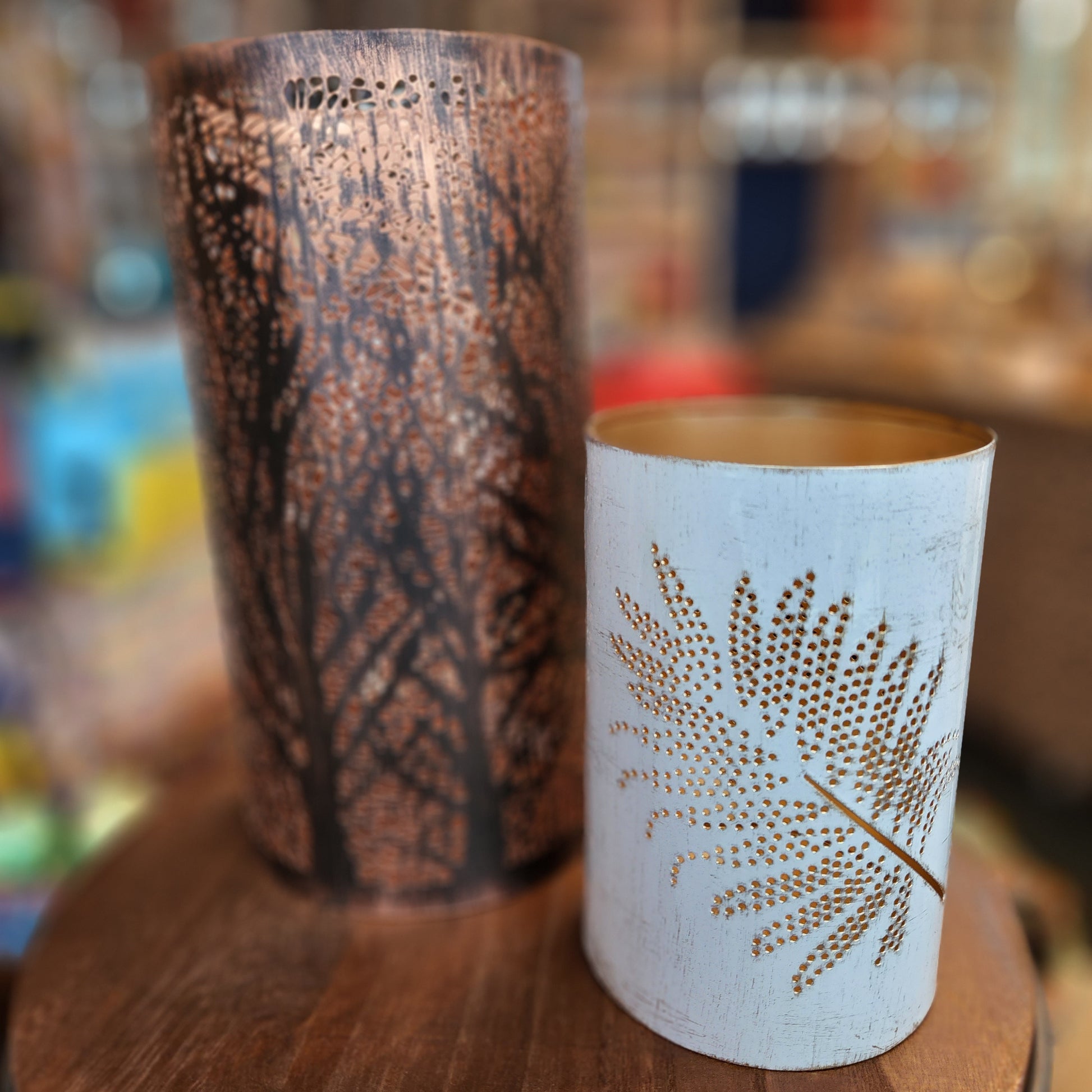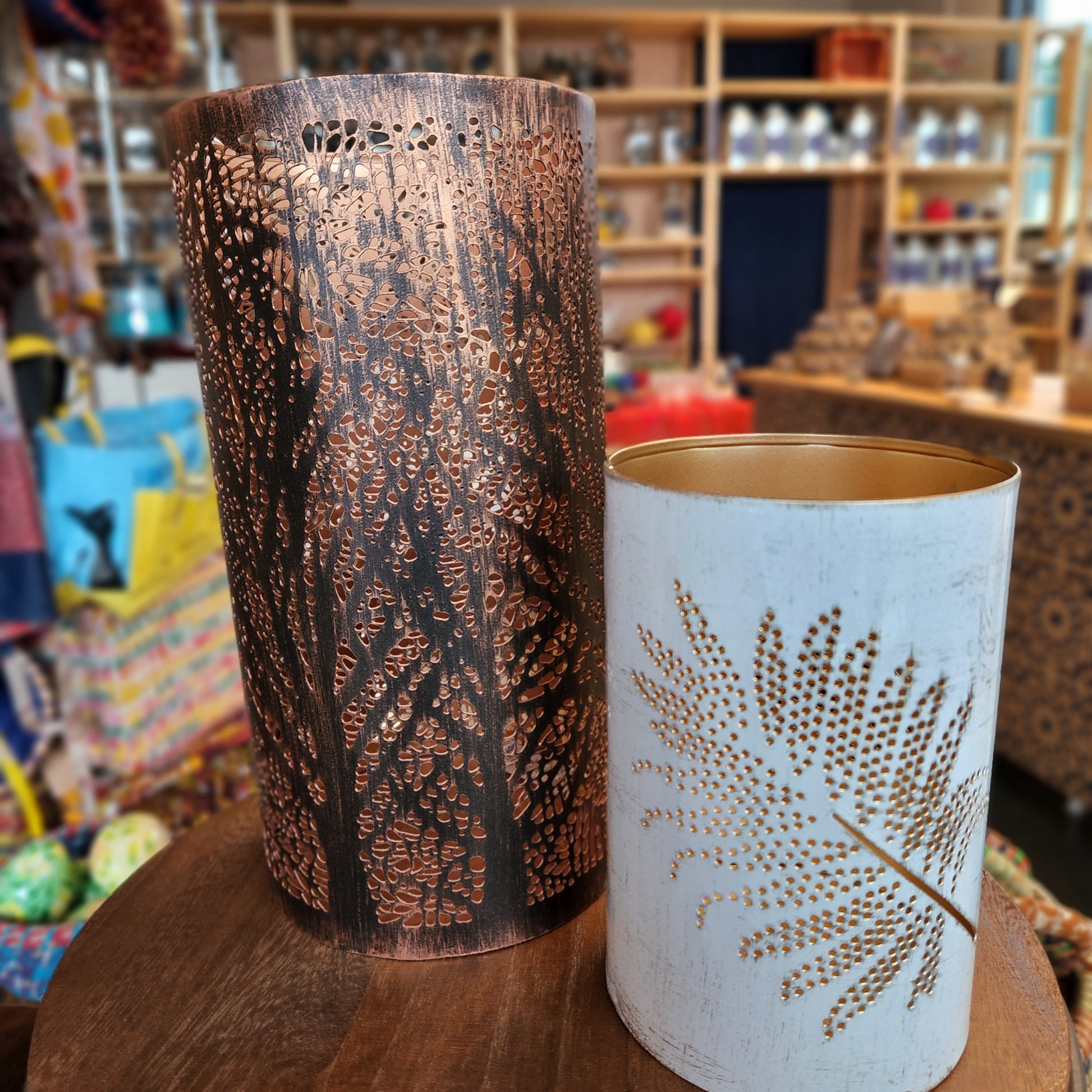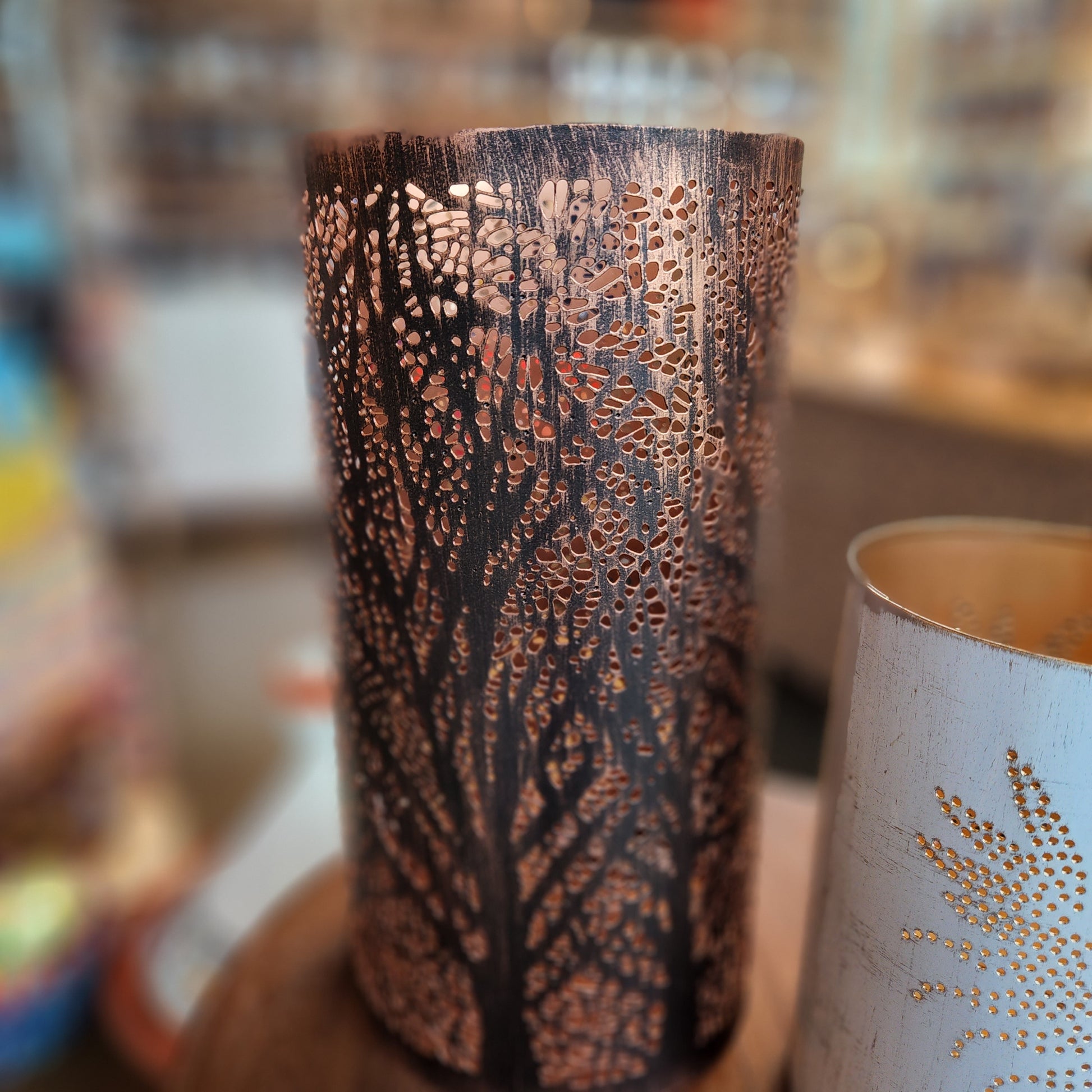 Made from partially recycled iron sheets, this lantern has a dark exterior and copper interior. The intricate work creates a beautiful pattern of trees that will look great when you illuminate it with candles or LED lights.